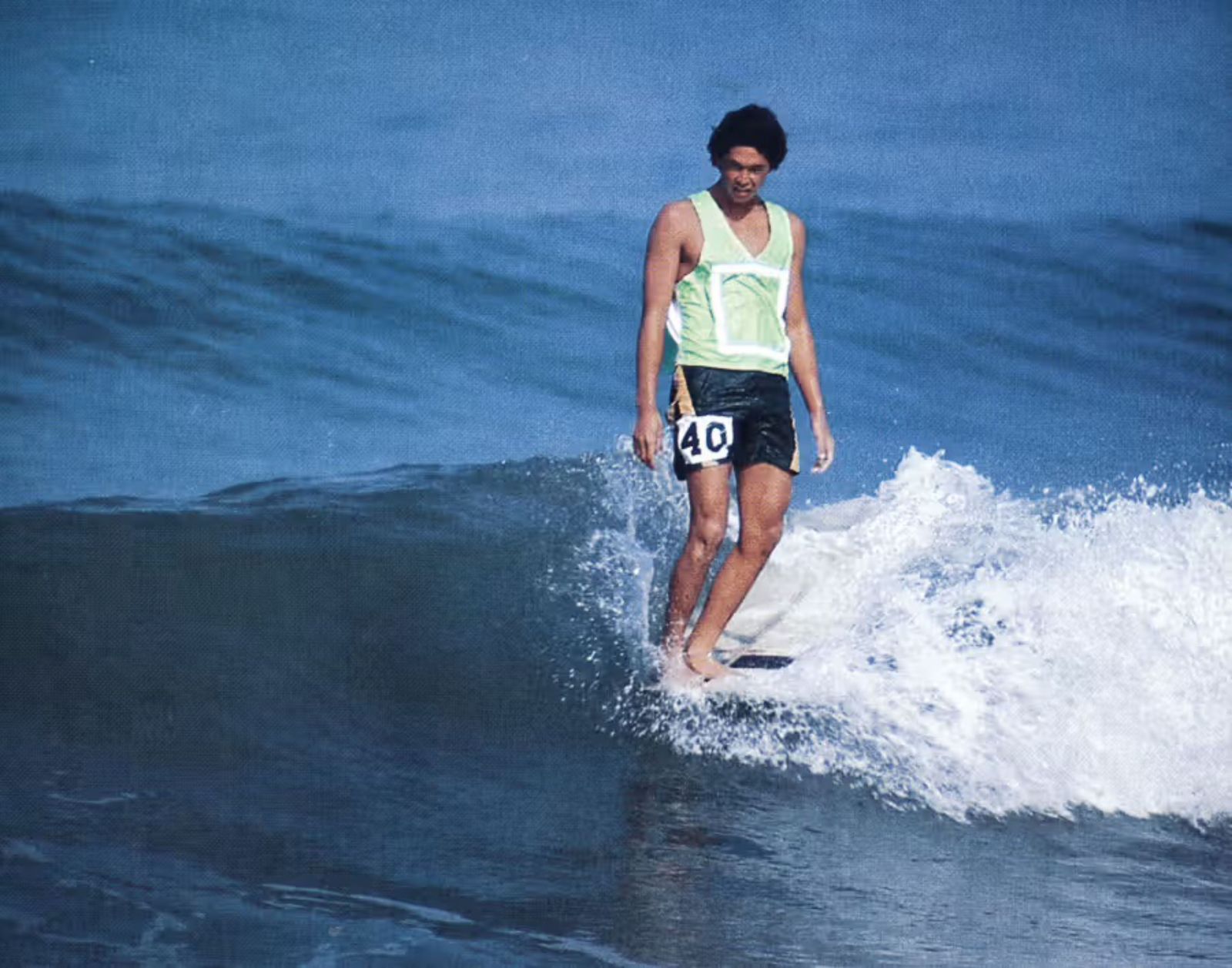 At 18-years-old David Nuuhiwa was universally regarded as one of the world’s best surfers. He rode in a pliable open-knee stance, deftly blended one turn to the next, and cross-stepped with cool self-possession across the deck of his board. Expert in all facets of the sport—save big-wave riding—Nuuhiwa was a preternaturally gifted noserider, able to suspend himself on the tip for seconds at a time. When Surfer magazine asked Phil Edwards to pick the world’s 10 best noseriders in 1965, he placed Nuuhiwa on top. “He was a pharaoh,” fellow Hawaiian-born surfer Reno Abellira later said. “David was surfing itself, noseriding to the adoring masses.” A first-generation surfing professional, Nuuhiwa signed endorsement deals in 1967 that were said to be worth $25,000. American surfers expected the slender goofyfoot to cruise to a world title in 1966—he won the Surfer Magazine Readers Poll Award that year, and the David Nuuhiwa Noseriding Model signature model by Bing Surfboards was the season’s hottest-selling board. Surfing came easy to Nuuhiwa. He was almost extra-human in the water, a hybrid, with panther-soft feet and maybe vestigial gills if you got close enough to see, and by age 17 his wave-riding style verged on the immaculate: arms resting low off the hips while trimming, face calm, shoulders, hands, legs, hips, and ankles all moving together as if they were coated in graphite. Where Phil Edwards made an art out of overreach and recovery, Nuuhiwa put his turns together like Rudolf Nureyev on a long pass across the floor at Lincoln Center. The two surfers were physically distinct as well: the slender and smooth-limbed Nuuhiwa, despite being just over six feet tall, looked almost waifish next to the hairy-shouldered Edwards. — courtesy Encyclopedia of Surfing EOS.SURF